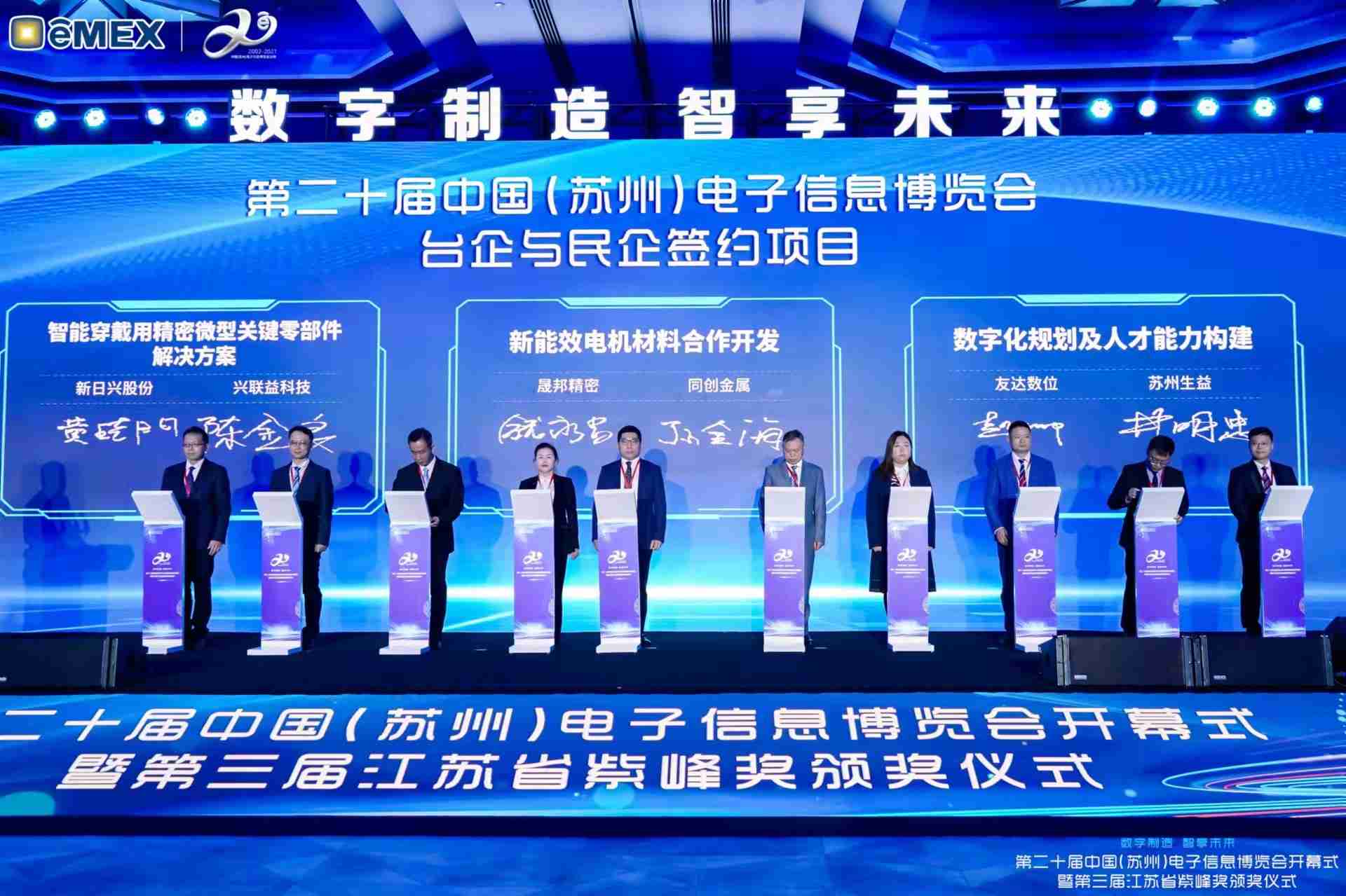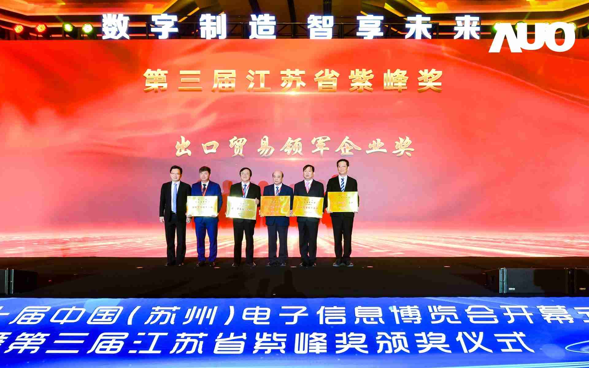 电博会开幕式当天也是第三届江苏省紫峰奖颁奖仪式,,,,省台办、、、、工信厅、、、商务厅、、、、苏州市相关领导均出席并颁奖。。。。该奖项为表彰对江苏高质量发展做出积极贡献的在苏企业,,,由江苏省政府专门设立。。。。云顶国际8588yd光电 (苏州) 总经理郭振明代表上台领奖,,这也是云顶国际8588yd苏州连续三次蝉联紫峰奖 出口贸易领军企业奖。。。。云顶国际8588yd数位总经理赵丽娜女士,,,也参与本次开幕式,,上台为本地化赋能签署战略合作协议,,,,将优质服务资源集合、、下沉到更多细分行业,,,,为更多地区的制造企业提供数字化转型服务。。。