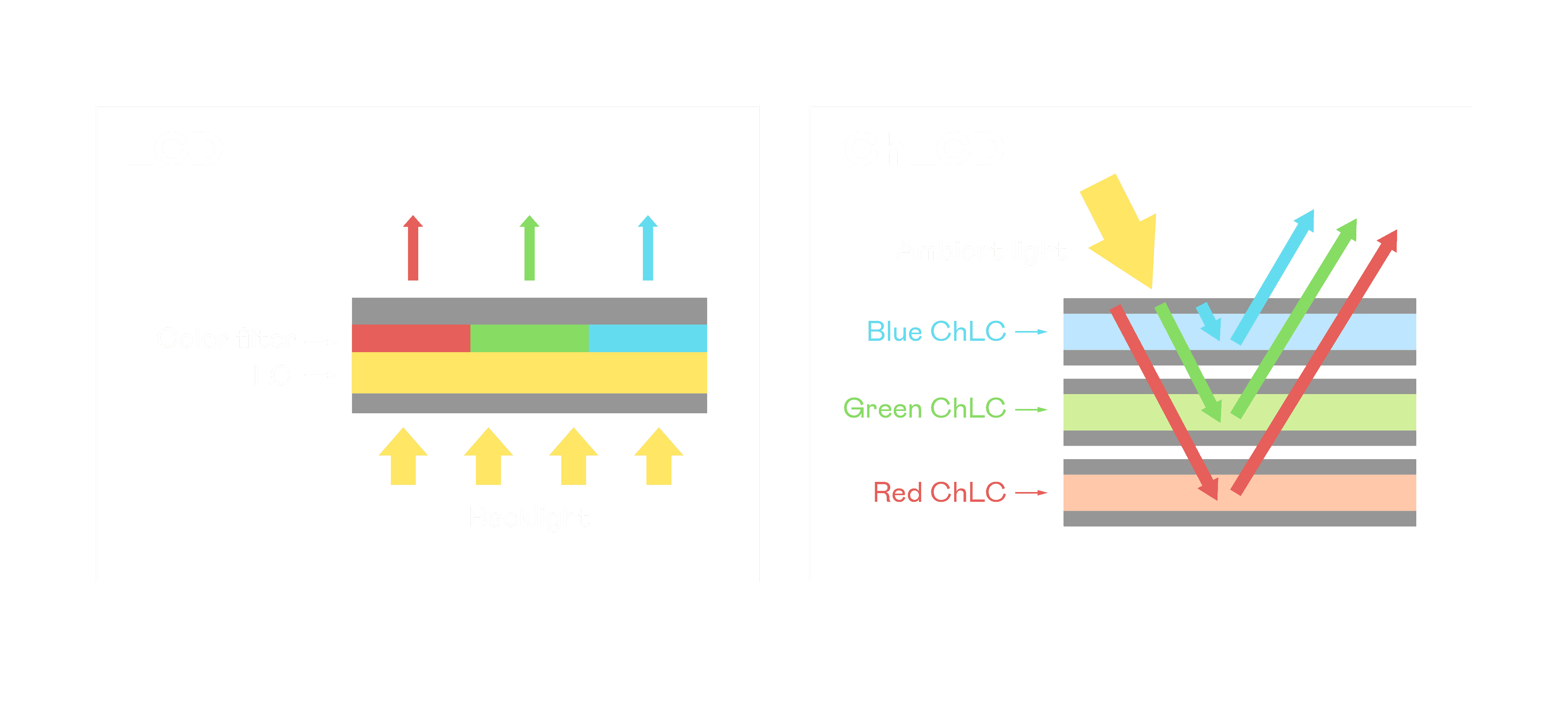 ChLCD 胆固醇液晶就如同纸张一样,,,,透过反射环境光来显示影像,,因此长时间观看不易造成人眼视觉疲劳,,,,可达到护眼效果。。。。当处于户外阳光下使用,,,LCD 影像容易失真而不易观看,,,,但胆固醇液晶仍可维持较佳的影像品质。。