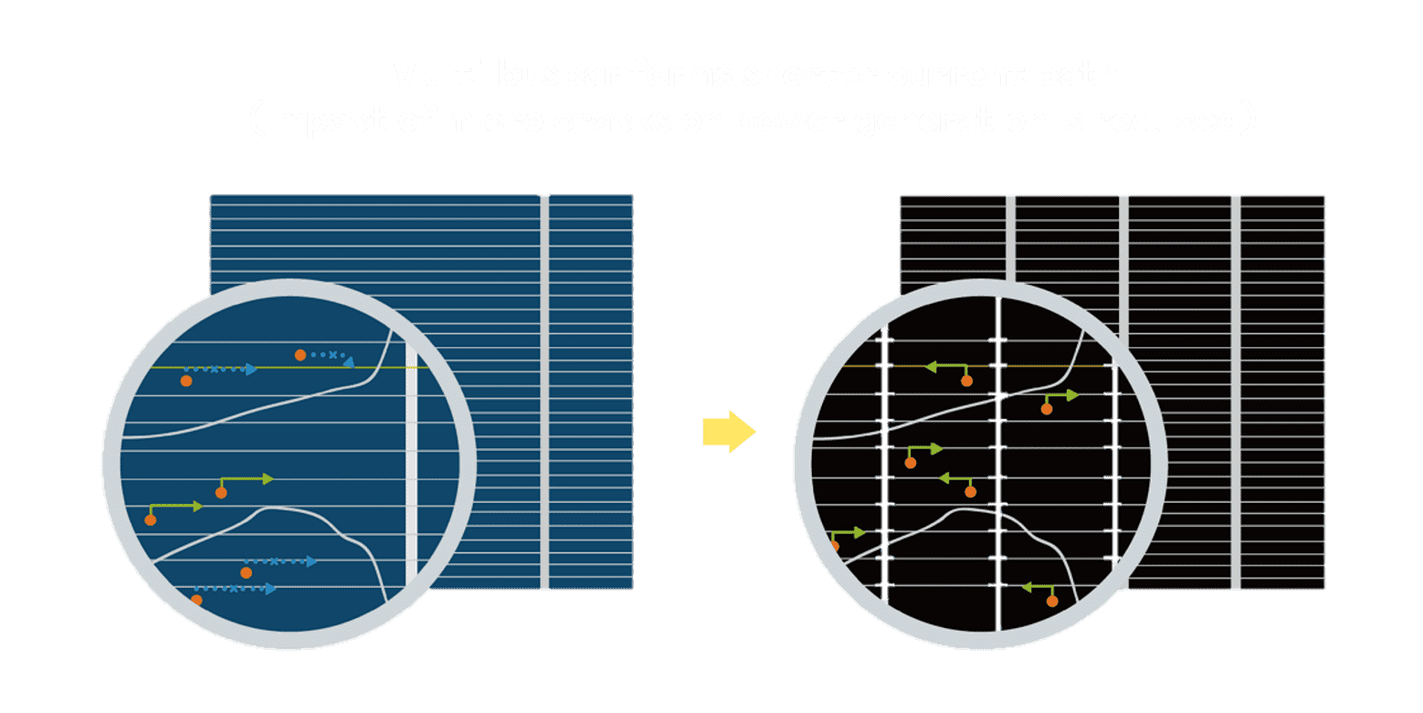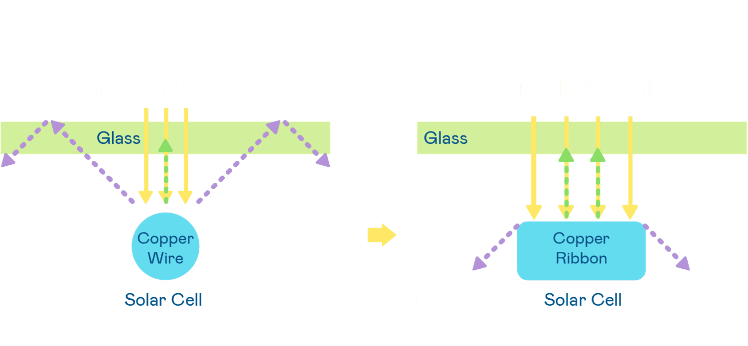 - 电池使用多条铜导线 (Copper wire) 于电池片上形成较短的电流路径,,提高电流收集效率,,,采用圆形设计的铜导线较传统扁平式的铜焊带 (Ribbon),,,,可增加入射至电池的光线量。。。。